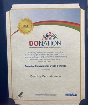 DORMINY MEDICAL CENTER EARNS NATIONAL RECOGNITION FOR PROMOTING ORGAN, EYE, AND TISSUE DONATION
